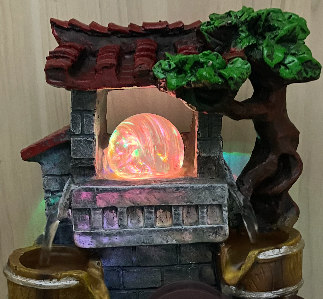 Nota: Si, al conectar no sale agua o la bola no gira, deberás levantarla un poco para aliviar presión sobre la bomba, después colócala. Los colores de la bola proviene de las luces conectadas a la bomba.